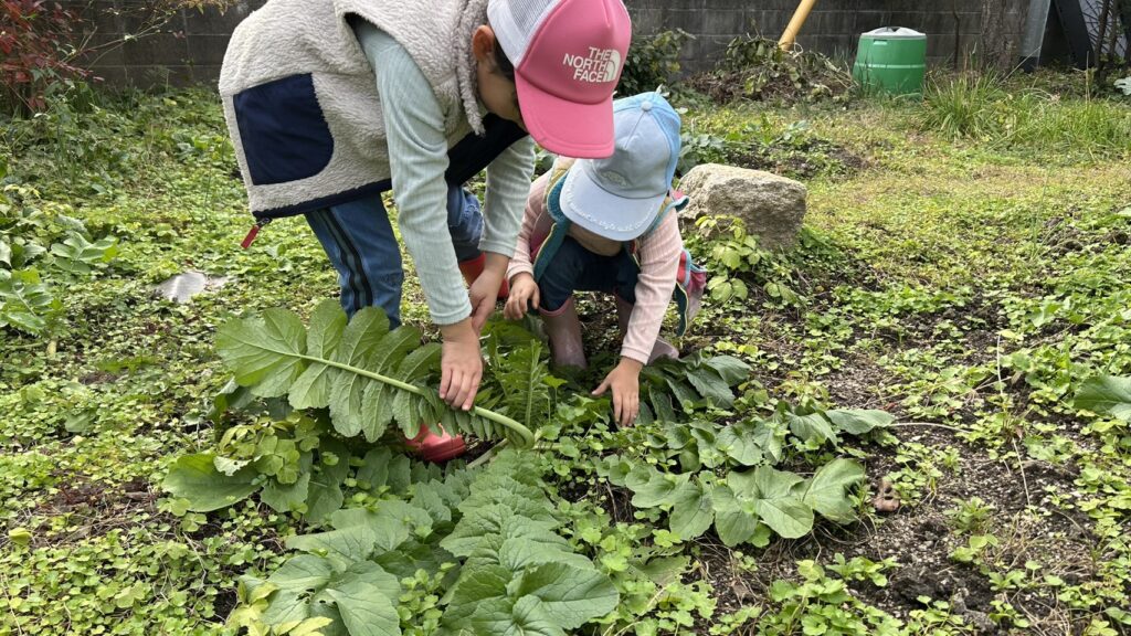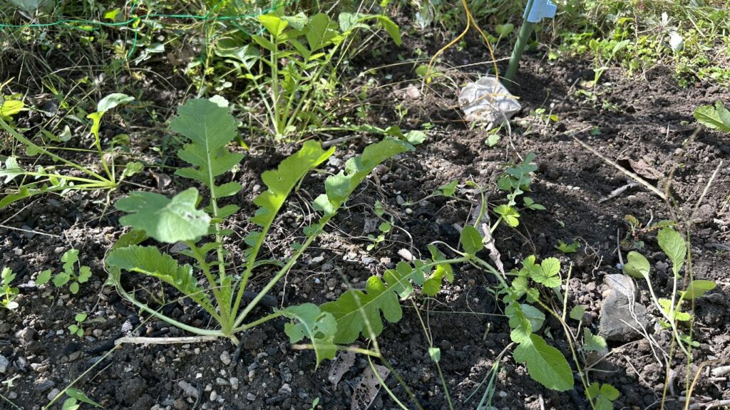 涼しくなると主役に躍り出るのが大根。この大根、自家採取でもう4年目くらいになるのではないかと思います。とくにせっきょくてきに植えているわけではないのですが、大根を収穫せずに放置しておき、菜の花が咲き、種がつくと、自然にまた庭に生えてきてくれます。不思議なものですね。例年は大根用の畑も用意していたのですが、最近は大根が生えたところが大根が選んだ場所である、ということで大根用のスペースを用意せず、とりあえず基本的にそのまま成長してもらってます。